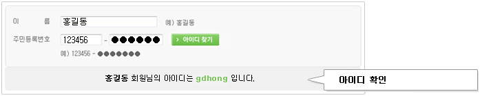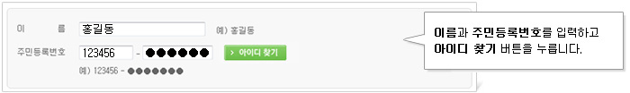 입력하신 이름, 주민등록번호와 일치하는 회원정보가 있는 경우 아이디를 바로 볼 수 있습니다.